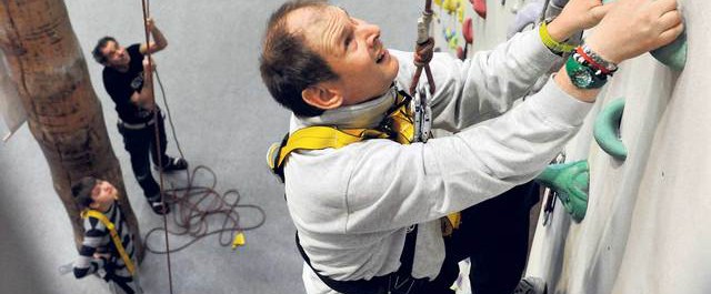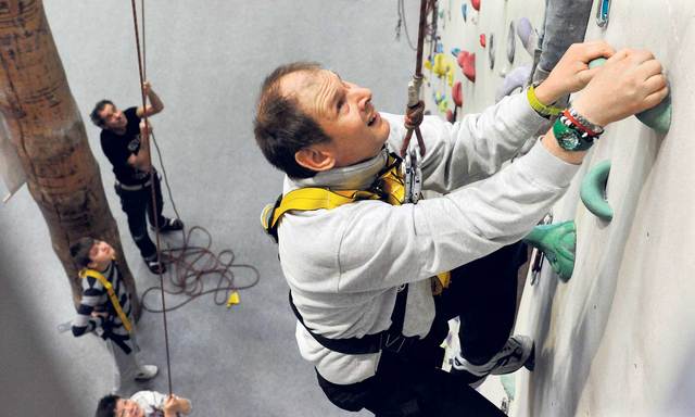 Dann wird richtig geklettert. Walter legt sich kurz hin, aber Kati Laws ruft: ‚Walter, steh auf, keine Zeit um sich auszuruhen.‘ Die Männer müssen den Klettergurt anziehen, das ist auch nicht ganz einfach. Manche sind zu eng, andere zu weit. Aber Kati Laws und Robert Bolli greifen ein und helfen, bis jeder Klettergurt richtig sitzt. Laws und das Ehepaar Bolli halten jeweils das Kletterseil, denn Menschen mit einer geistigen Behinderung haben nicht die Kraft, um ohne Seil zu klettern. Das Ziel ist, die 13 Meter hohe Kletterwand hinaufzusteigen und eine oben installierte Glocke anzuschlagen. Die Griffe in der Wand sind verschieden farbig. Das sind Zeichen des Schwierigkeitsgrads. Beide Kletterwände im Aranea sind ebenso wie die Wand an der freien Luft so eingerichtet. Man kann ganz leichte Routen oder richtig schwierige auswählen. Die Kletterroute für die Männer der Vereinigung Cerebral Schaffhausen gehört zu den eher leichten. Die Trainerin kennt die Teilnehmer gut, man spürt den guten Kontakt, den sie zu den Menschen mit Behinderung hat.